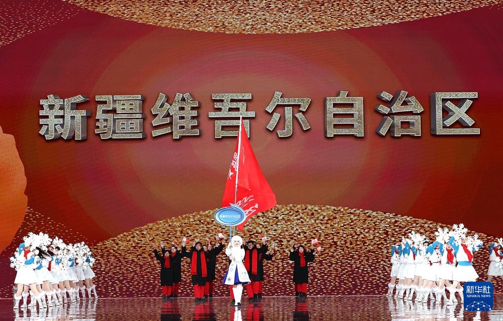 ??2月17日,新疆維吾爾自治區(qū)體育代表團(tuán)在開幕式上入場(chǎng)。新華社記者 李博 攝