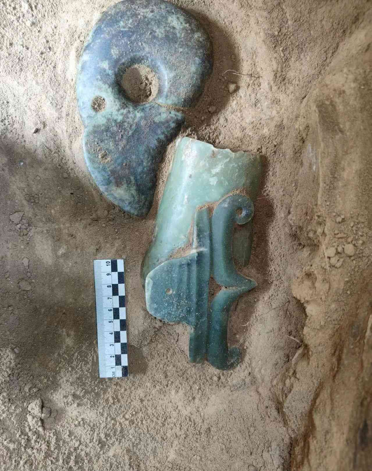 出土器物以無底筒形器和玉石器為主,其它也見打制石器、細石葉、蚌貝類及骨器等。生活用陶極少。玉石器此次共計百余件,種類有環(huán)、璧、方璧、璜、斧、鑿、錐、鉞、蠶、蟬、龍以及各類鉆芯、玉料、切割的廢料等。對出土玉器的初步研究發(fā)現(xiàn),祭祀用玉和墓葬內(nèi)的葬玉存在顯著差異,前者材差且殘但器型豐富,數(shù)量較多。而墓葬內(nèi)用玉則料美工精,不乏重器。