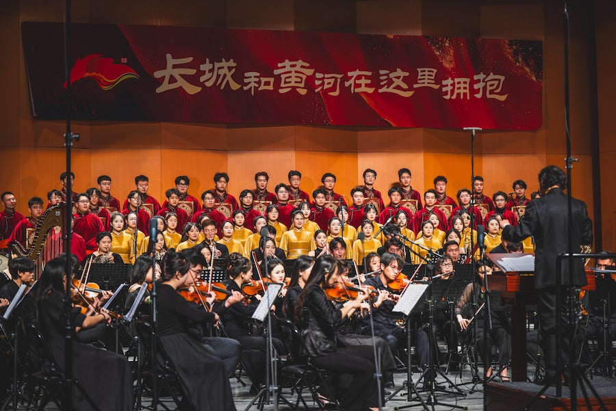整場演出以“相擁”“相依”“相融”三個(gè)篇章的宏大敘述,深情表達(dá)“黃河兩岸是我家,長城內(nèi)外是故鄉(xiāng)”,通過對(duì)民族優(yōu)秀音樂曲目的創(chuàng)新、對(duì)經(jīng)典藝術(shù)作品的再現(xiàn),展示北疆大地長城文化、黃河文化的深厚底蘊(yùn)和鮮明特質(zhì)。