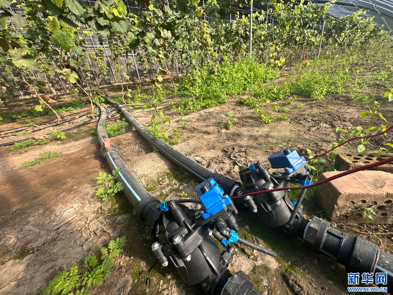 ??包頭市東河區(qū)沙爾沁一村果路農(nóng)業(yè)葡萄種植基地溫室里,通過(guò)管道輸送葡萄樹苗所需營(yíng)養(yǎng)成份。新華網(wǎng)發(fā)(張建芳 攝)
