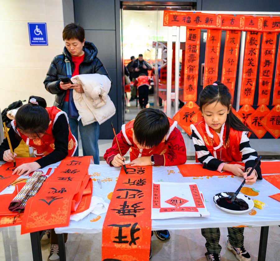 小朋友也參與到寫(xiě)春聯(lián)的活動(dòng)中