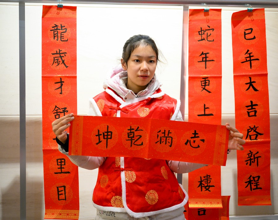 一名小朋友在展示自己書(shū)寫(xiě)的春聯(lián)