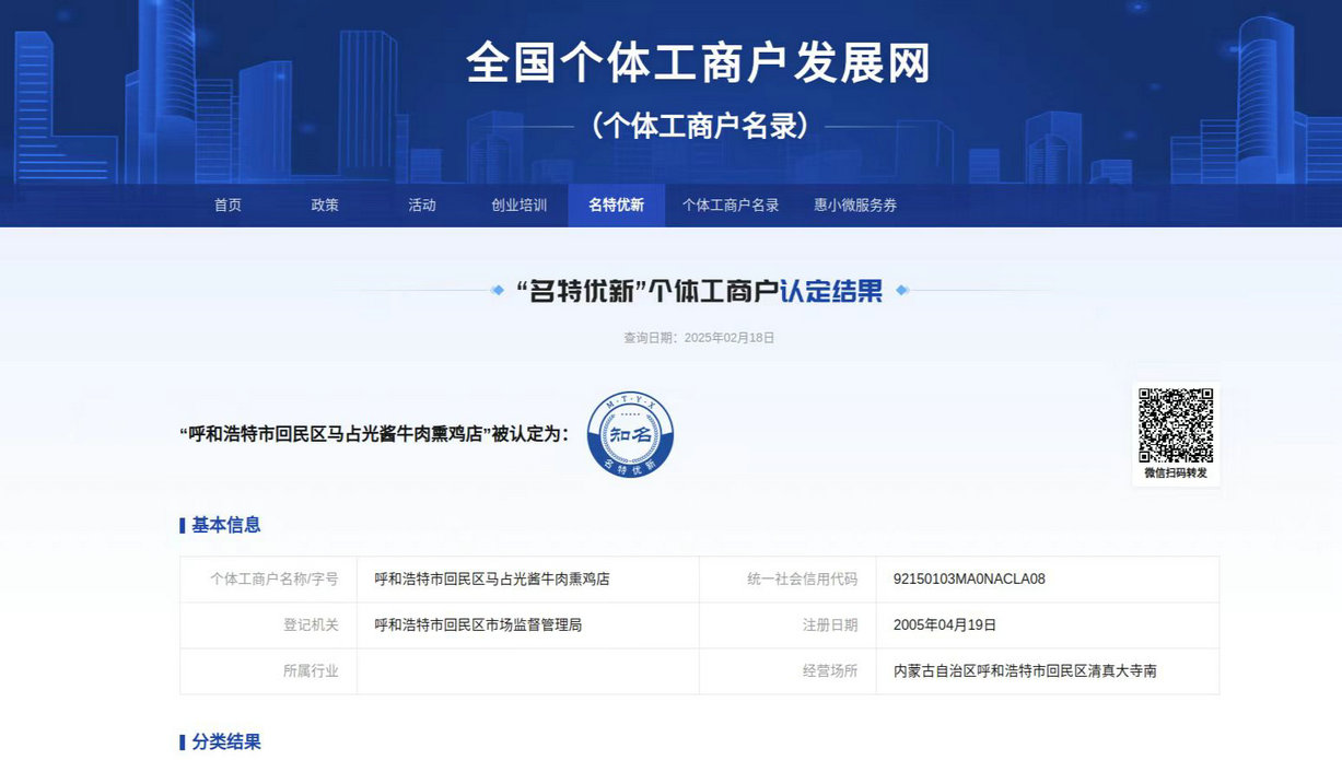 去年,呼和浩特市市場監(jiān)管局等16個市級部門聯(lián)合制定實施《呼和浩特市個體工商戶分型分類實施方案(試行)》,開展“名特優(yōu)新”個體工商戶申報和推薦工作。通過線上線下雙渠道,利用個體工商戶服務月活動,向廣大個體工商戶普及申報政策和流程,鼓勵符合條件的個體工商戶參與申報。通過材料審核、走訪核實、征求意見、評審認定、信息公示等程序,經(jīng)區(qū)縣、市、自治區(qū)逐級復核上報,呼和浩特市首批認定全國“名特優(yōu)新”的27戶個體工商戶已完成入庫(其中“知名”15戶、“特色”10戶、“優(yōu)質”2戶),被認定的個體工商戶可享受由國家、自治區(qū)、市出臺的相關扶持培育政策。