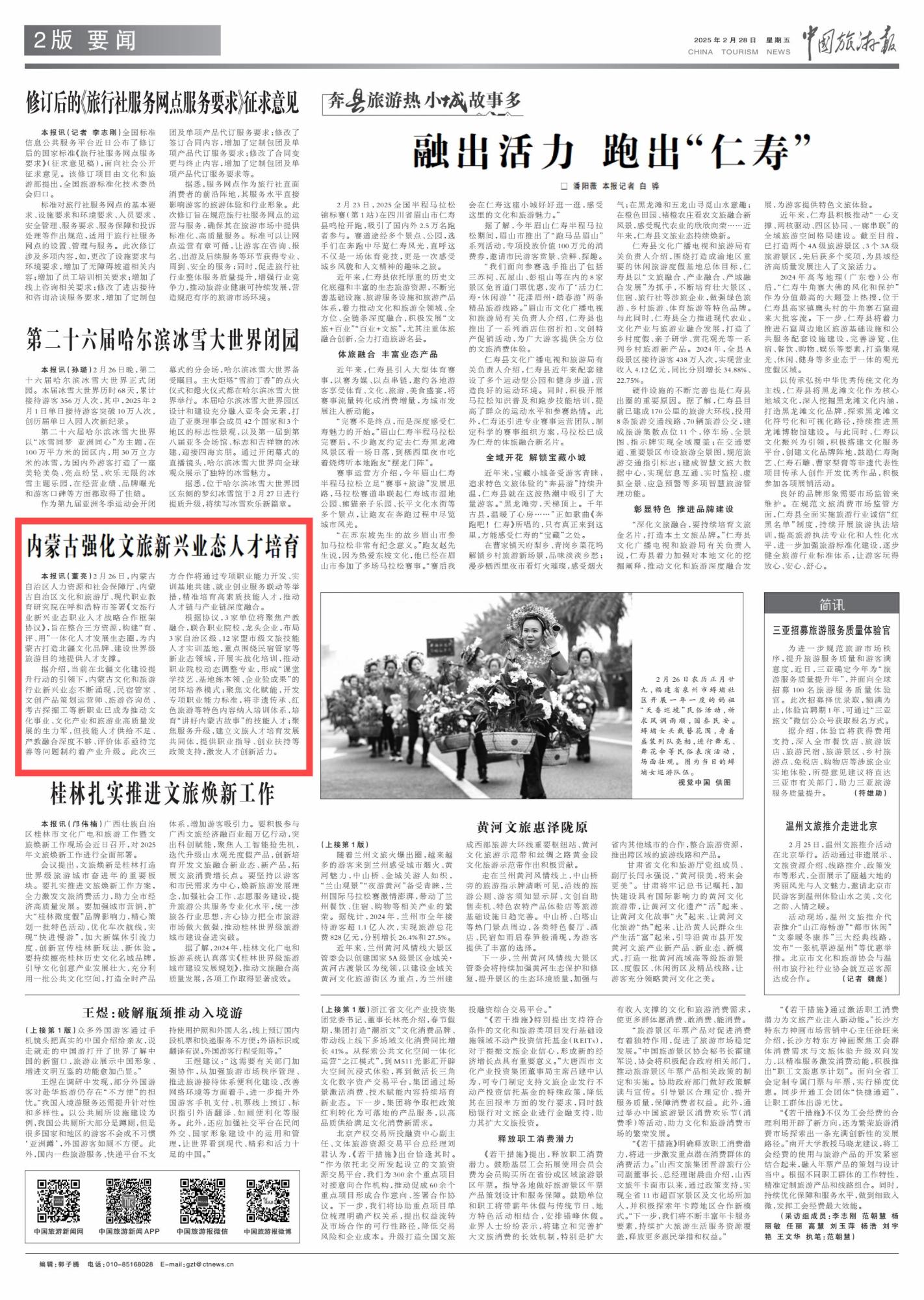 2015年2月28日,《中國旅游報》第2版刊發(fā)題為《內(nèi)蒙古強(qiáng)化文旅新興業(yè)態(tài)人才培育》的消息,報道了內(nèi)蒙古整合三方資源,構(gòu)建“育、評、用”一體化人才發(fā)展生態(tài)圈,為內(nèi)蒙古打造北疆文化品牌、建設(shè)世界級旅游目的地提供人才支撐。