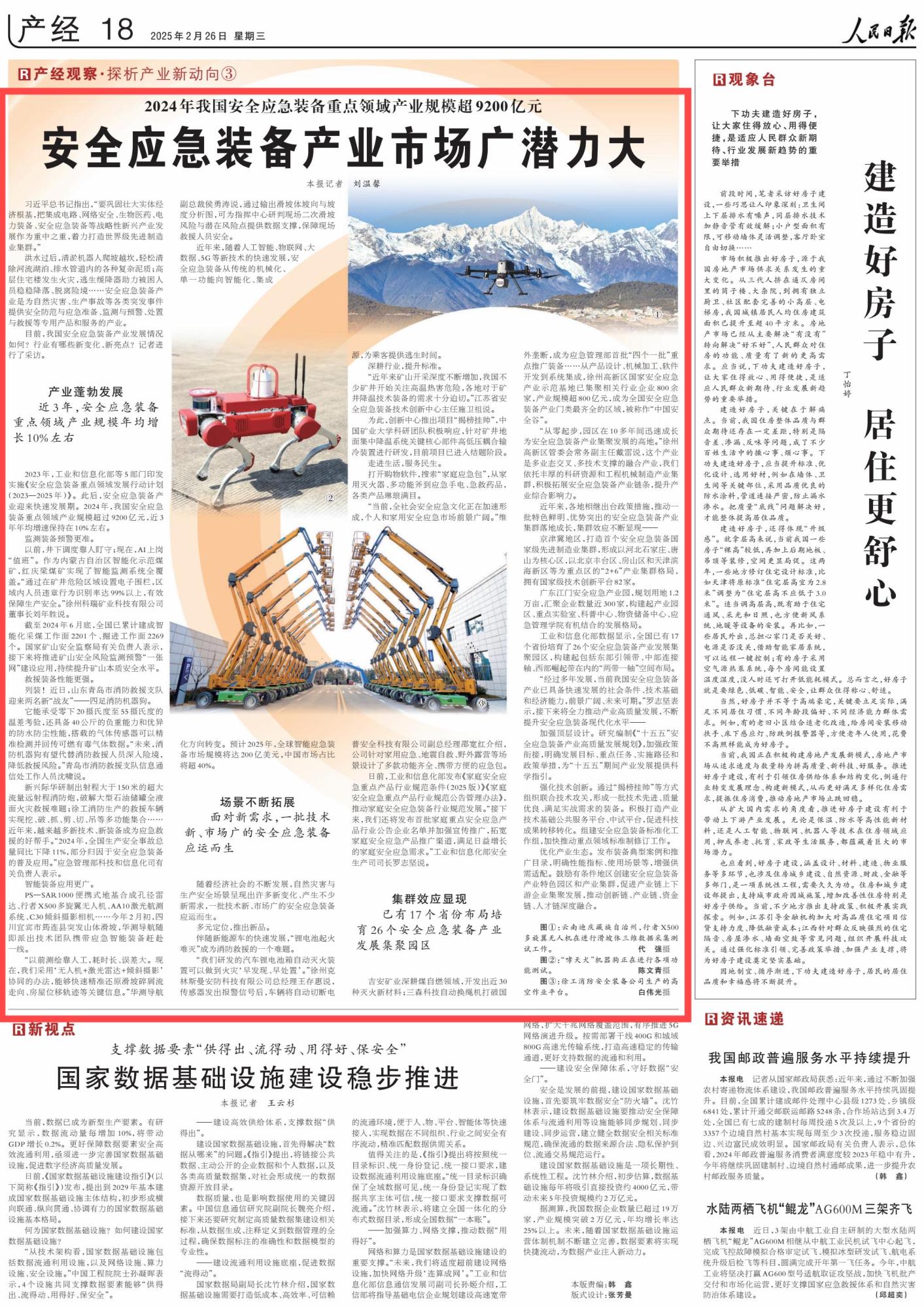 2025年2月26日,《人民日?qǐng)?bào)》第18版刊發(fā)題為《2024年我國(guó)安全應(yīng)急裝備重點(diǎn)領(lǐng)域產(chǎn)業(yè)規(guī)模超9200億元 安全應(yīng)急裝備產(chǎn)業(yè)市場(chǎng)廣潛力大》的報(bào)道,2024年,我國(guó)安全應(yīng)急裝備重點(diǎn)領(lǐng)域產(chǎn)業(yè)規(guī)模超過9200億元,其中,內(nèi)蒙古自治區(qū)紅慶梁煤礦實(shí)現(xiàn)了智能監(jiān)測(cè)系統(tǒng)全覆蓋。