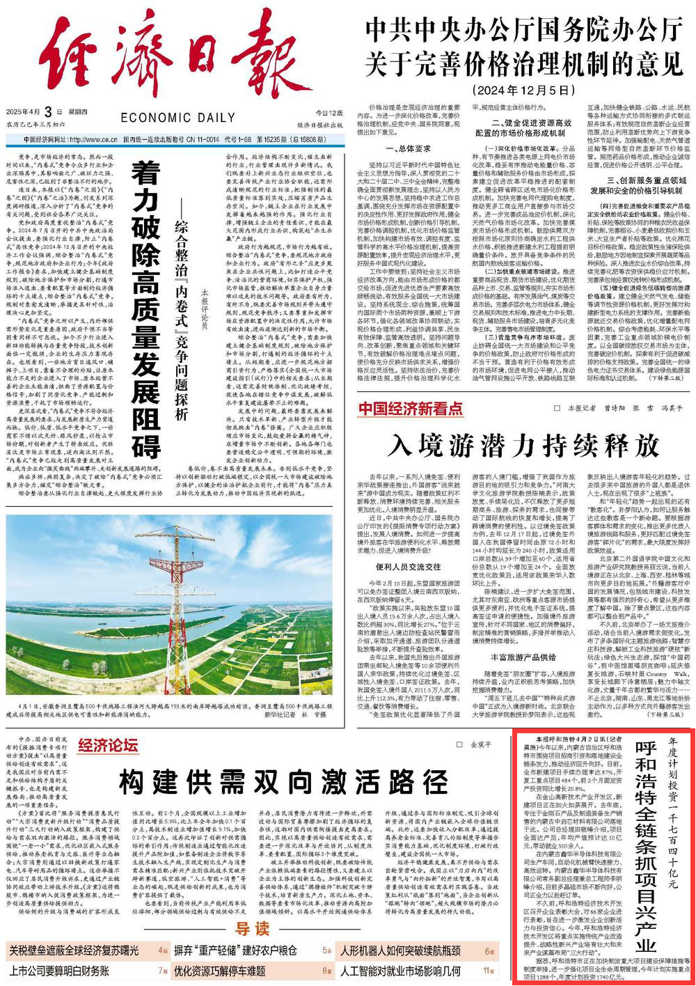 2025年4月3日,《經(jīng)濟日報》第1版刊發(fā)題為《年度計劃投資一千七百四十億元 呼和浩特全鏈條抓項目興產(chǎn)業(yè)》的文章,報道了今年以來,內(nèi)蒙古自治區(qū)呼和浩特市圍繞項目招商引資和落地建設(shè)全鏈條發(fā)力,推動經(jīng)濟回升向好。