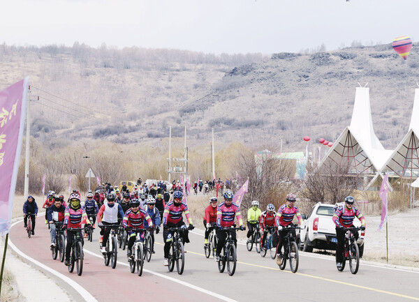 5月19日,在內(nèi)蒙古自治區(qū)興安盟阿爾山市奧倫布坎景區(qū),游客們參加騎行活動(dòng)。