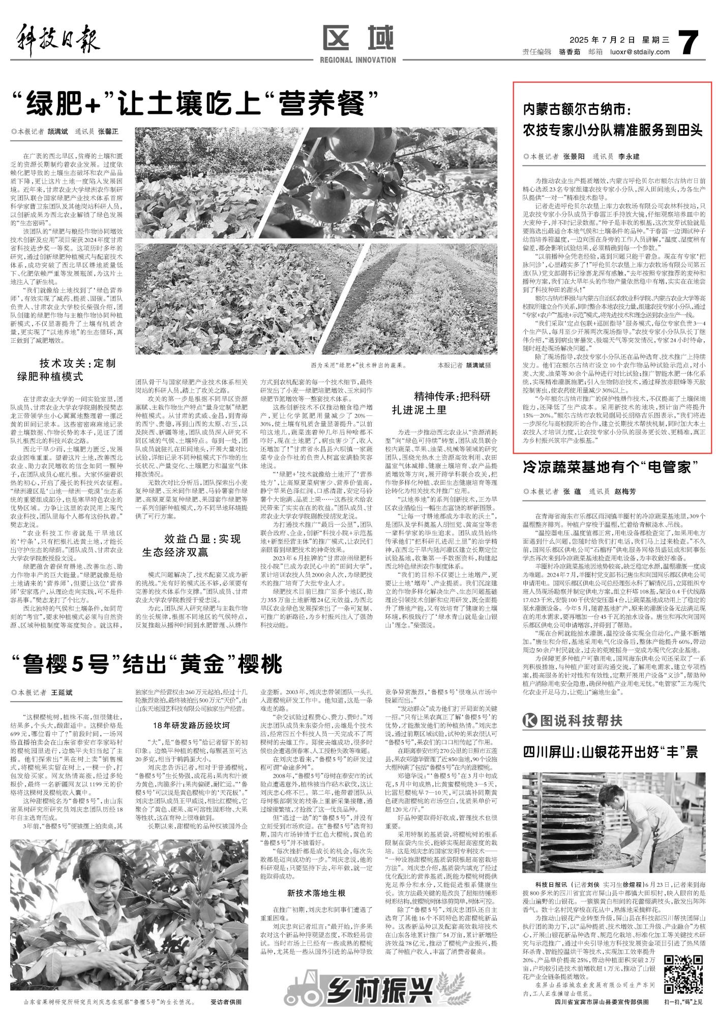 2025年7月2日《科技日報》第7版刊發(fā)了《內蒙古額爾古納市:農技專家小分隊精準服務到田頭》的文章,報道了內蒙古呼倫貝爾市額爾古納市積極與內蒙古自治區(qū)農牧業(yè)科學院、內蒙古農業(yè)大學等高校院所建立合作關系,同時整合本地農技力量,組建農技專家小分隊,通過“專家+農戶”“基地+示范”模式,將先進技術和理念送到農業(yè)生產一線。