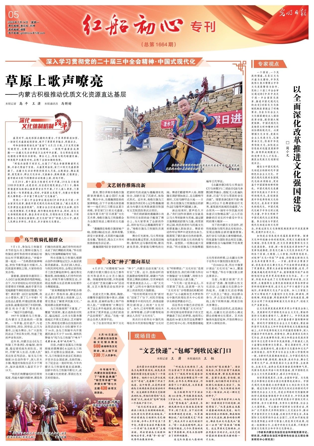 2025年7月14日,《光明日?qǐng)?bào)》第5版刊發(fā)題為《草原上歌聲嘹亮——內(nèi)蒙古積極推動(dòng)優(yōu)質(zhì)文化資源直達(dá)基層》的文章,報(bào)道了盛夏時(shí)節(jié),地處祖國(guó)北疆的內(nèi)蒙古,千里草原綠浪如茵。一場(chǎng)場(chǎng)藝術(shù)盛宴連續(xù)登場(chǎng),賦予了草原更多魅力、更強(qiáng)活力。
