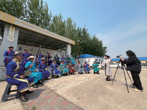 5月21日,記者走進吐列毛杜鎮(zhèn)鐵特格嘎查,恰巧遇到鎮(zhèn)黨委宣傳委員高薩日娜正在拍攝最新一期的《村聞聯(lián)播》。嘎查小舞臺上,17名村民身著蒙古族服飾,手持四胡演奏著《烏力格爾三部曲》《牧民歌唱共產(chǎn)黨》等悠揚的樂曲。他們大部分年齡都在五六十歲,來自當?shù)氐睦ざ祭渌暮鷧f(xié)會。該協(xié)會共有60余名會員,多年來以四胡彈奏、科爾沁民歌、烏力格爾(一種蒙古族的曲藝說書形式)、好來寶說唱等各種方式,參與著吐列毛杜鎮(zhèn)文化志愿服務。