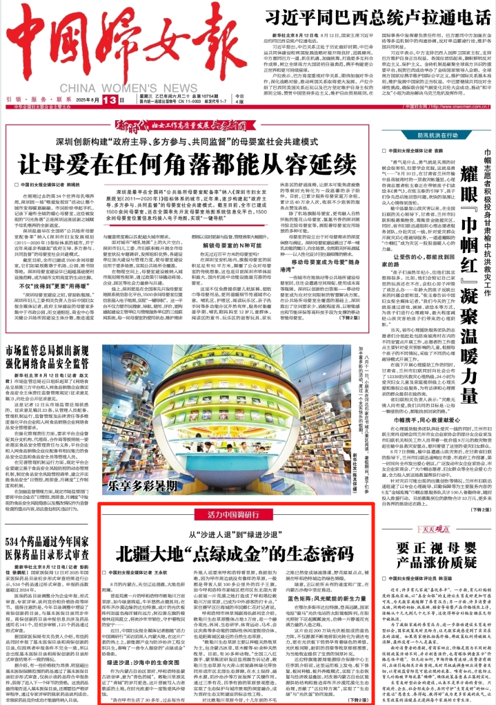 2025年8月13日,《中國(guó)婦女報(bào)》第1版刊發(fā)題為《從“沙進(jìn)人退”到“綠進(jìn)沙退” 北疆大地“點(diǎn)綠成金”的生態(tài)密碼》的文章,報(bào)道了“活力中國(guó)調(diào)研行”采訪團(tuán)深入內(nèi)蒙古大地,在這片廣袤的熱土上,新能源產(chǎn)業(yè)與防沙治沙工程交織共生,奏響了一曲令人振奮的“點(diǎn)綠成金”協(xié)奏曲。