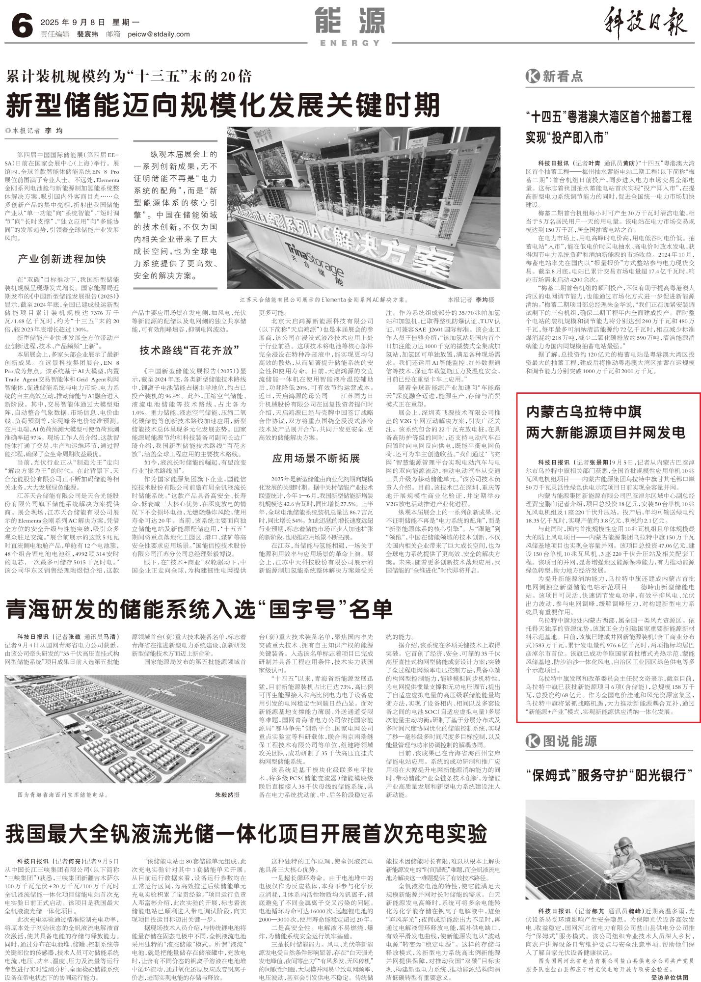 2025年9月8日,《科技日?qǐng)?bào)》第6版整版刊發(fā)題為《內(nèi)蒙古烏拉特中旗兩大新能源項(xiàng)目并網(wǎng)發(fā)電》的文章,報(bào)道了記者從內(nèi)蒙古巴彥淖爾市烏拉特中旗相關(guān)部門獲悉,全國首批規(guī)模性應(yīng)用單機(jī)10兆瓦風(fēng)電機(jī)組項(xiàng)目——內(nèi)蒙古能源集團(tuán)烏拉特中旗甘其毛都口岸50萬千瓦靈活性綠色供電示范項(xiàng)目日前實(shí)現(xiàn)全容量并網(wǎng)。