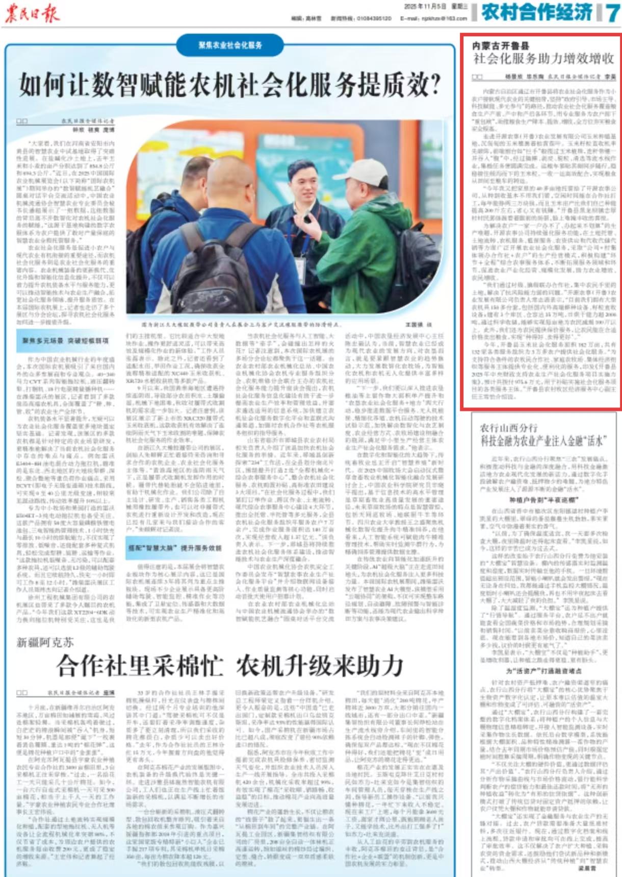 2025年11月5日,《農(nóng)民日報》第7版刊發(fā)題為《內(nèi)蒙古開魯縣:社會化服務(wù)助力增效增收》的文章,報道了今年以來,內(nèi)蒙古開魯縣玉米社會化服務(wù)面積182萬畝,共有132家各類服務(wù)組織為3萬多農(nóng)戶提供社會化服務(wù)。