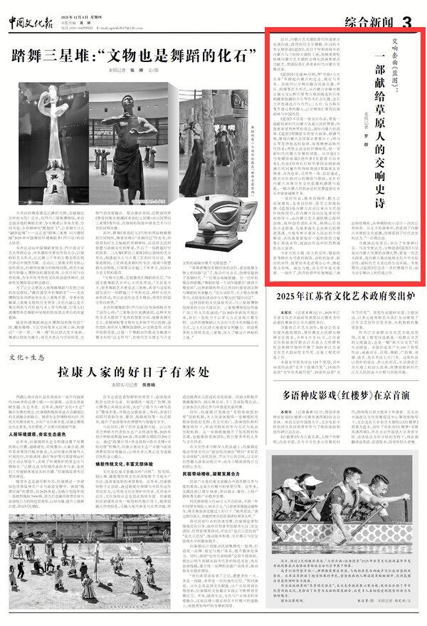 2025年12月4日《中國文化報》第3版刊發(fā)了《交響套曲《藍圖》:一部獻給草原人的交響史詩》的文章,報道了近日,內(nèi)蒙古藝術(shù)劇院委約作曲家方崠清作曲,曾偉擔任文學撰稿、作詞的大型交響套曲《藍圖》,在位于呼和浩特市的內(nèi)蒙古烏蘭恰特大劇院上演,指揮家黃屹執(zhí)棒內(nèi)蒙古藝術(shù)劇院交響樂團演奏家合力獻藝,用國際語匯講述新時代內(nèi)蒙古發(fā)展故事。