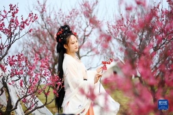 2月25日,古風(fēng)愛好者在長安唐村梅園內(nèi)拍攝視頻。