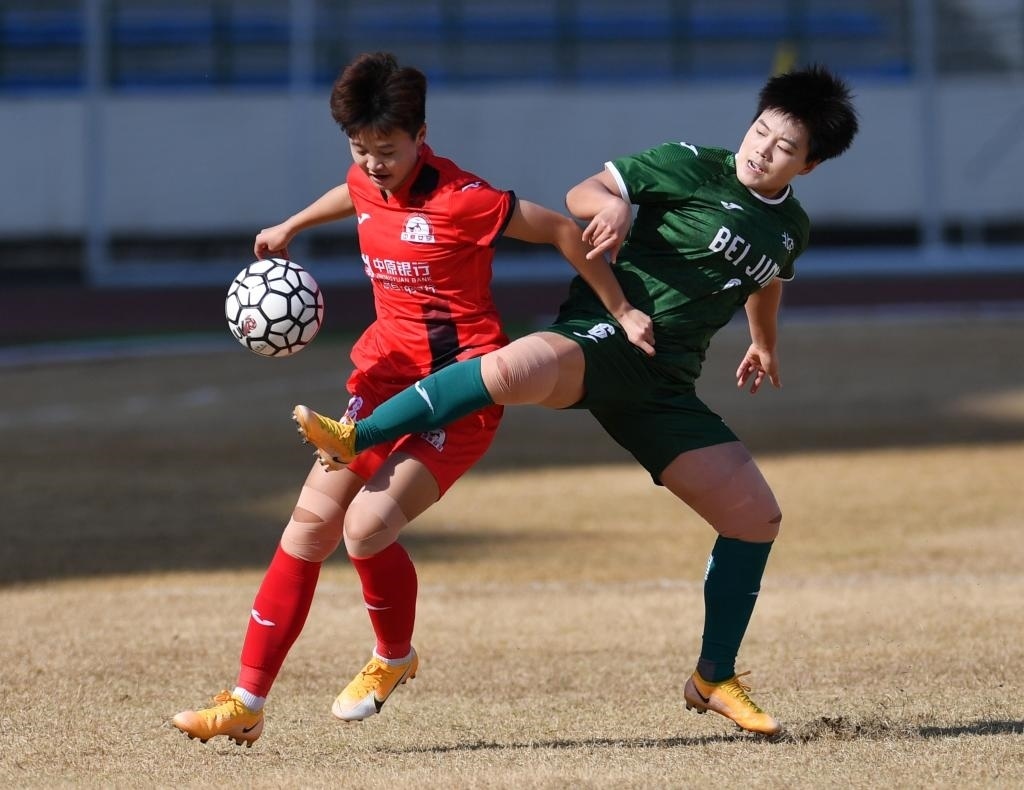 3月4日,北京女足隊球員馬曉蘭(右)與河南中原女足隊球員樊夢霏在比賽中拼搶。新華社記者 李嘉南 攝