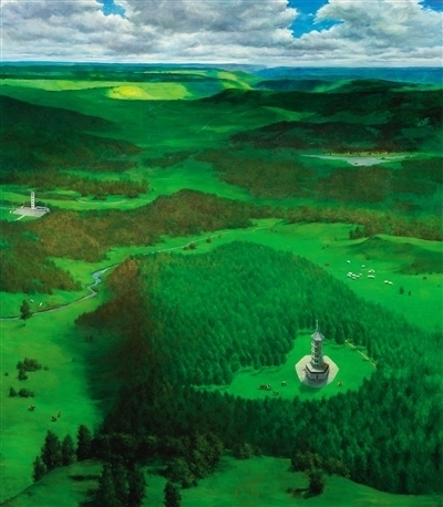 河北塞罕壩林場(chǎng),是“三北”工程建設(shè)的重要區(qū)域。荒原變林海的塞罕壩奇跡,成為近年來(lái)主題性美術(shù)創(chuàng)作的重要課題。入選“筑夢(mèng)——我們的新時(shí)代美術(shù)攝影作品展”的譚智群油畫《美麗的塞罕壩》,是在實(shí)地寫生基礎(chǔ)上的藝術(shù)提煉和情感升華。作者以俯視的構(gòu)圖,鋪展?jié)M目蒼翠的美景。畫面左側(cè),清澈的河流蜿蜒向前;畫面右側(cè),白色的雁群逐綠翱翔;遠(yuǎn)方,茂密的森林不斷延伸,風(fēng)力發(fā)電機(jī)林立于山巔,畫面充滿生機(jī)與活力。同樣以俯視的角度處理構(gòu)圖,孔亮油畫《美麗中國(guó)——塞罕壩》則以塞罕壩林場(chǎng)和塞罕塔為視覺中心,蔥蘢的綠意,將意境渲染得更加深邃。翁凱旋油畫《滄海桑田——塞罕壩的前世今生》,通過(guò)三聯(lián)畫的形式,在新舊對(duì)比中構(gòu)建時(shí)空長(zhǎng)廊,描繪出塞罕壩的時(shí)代變遷。