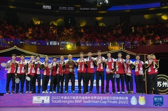 5月21日,2023年蘇迪曼杯世界羽毛球混合團(tuán)體錦標(biāo)賽頒獎(jiǎng)儀式在江蘇省蘇州市舉行。中國(guó)隊(duì)在決賽中以3比0戰(zhàn)勝韓國(guó)隊(duì),奪得冠軍。圖為中國(guó)隊(duì)在頒獎(jiǎng)儀式上慶祝。新華社記者 杜宇 攝