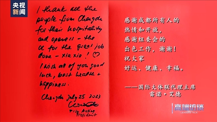 國際大體聯(lián)代理主席雷諾·艾德在接受總臺專訪后題詞:感謝成都所有人的熱情和開放,感謝組委會的出色工作,謝謝!祝大家好運、健康、幸福。
