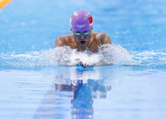 11月1日,南京市選手董志豪在比賽中,他獲得男子100米蛙泳公開組冠軍。當(dāng)日,第一屆全國(guó)學(xué)生(青年)運(yùn)動(dòng)會(huì)游泳項(xiàng)目比賽在廣西南寧開賽。新華社記者 胡星宇 攝