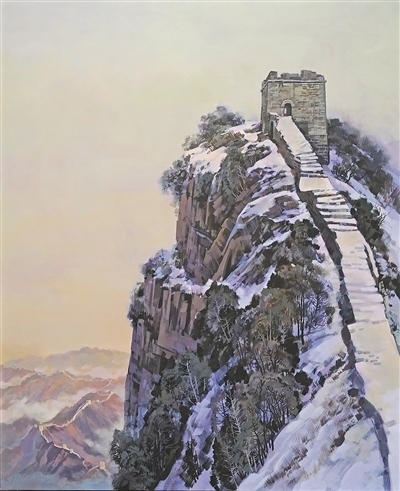 在長城沿線居民看來,長城是他們?nèi)粘I畹囊徊糠?。美術工作者試圖將長城的這種平凡之美體現(xiàn)在作品中。陳平中國畫《長城腳下》、蔣世國中國畫《家住長城溪水邊》等作品,均以俯瞰視角描繪長城腳下人家的閑適生活。在畫家筆下,長城并非抽象之物,而是許多人從小生活的地方,是帶著煙火氣、承載著鄉(xiāng)愁的古跡。王合群油畫《長城腳下的鄰居》更是別出心裁,聚焦生活在長城腳下的老兩口的新生活,屋內(nèi)干凈整潔,窗外長城巍峨,畫面生動,意趣盎然。這些作品共同呈現(xiàn)了長城親切而鮮活的一面。
