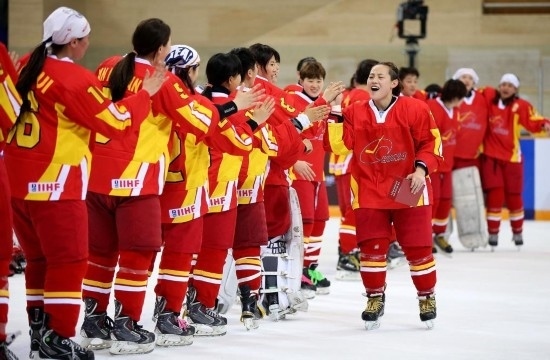 2015年4月11日,中國(guó)隊(duì)球員齊雪婷(右前)在獲頒本場(chǎng)最佳球員后與隊(duì)友擊掌慶祝。當(dāng)日,在北京舉行的2015國(guó)際冰聯(lián)女子冰球世錦賽甲級(jí)B組比賽中,中國(guó)隊(duì)以4比3戰(zhàn)勝意大利隊(duì)。新華社記者李明攝