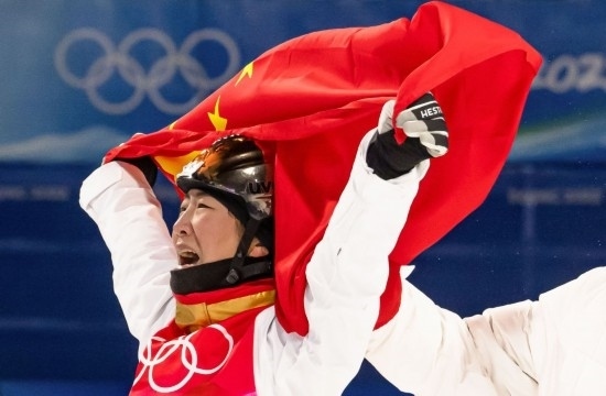 2022年2月14日,北京冬奧會自由式滑雪女子空中技巧決賽在張家口云頂滑雪公園舉行。中國選手徐夢桃在奪冠后慶祝。新華社記者 肖藝九 攝