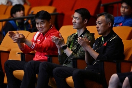 2023年5月26日,中國乒乓球協(xié)會副主席王勵勤(中)在南非德班進行的2023年世界乒乓球錦標賽男子單打四分之一決賽中觀戰(zhàn)。新華社記者 陶希夷 攝