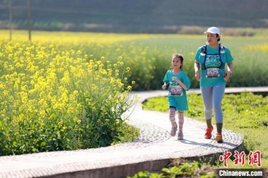 家庭參賽選手穿越油菜花田。賽事組委會供圖