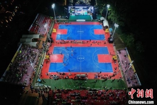 2023年8月2日晚,全國(guó)和美鄉(xiāng)村籃球大賽(村BA)東北賽區(qū)揭幕戰(zhàn)在天津市薊州區(qū)郭家溝村開賽。(無人機(jī)照片) 佟郁 攝