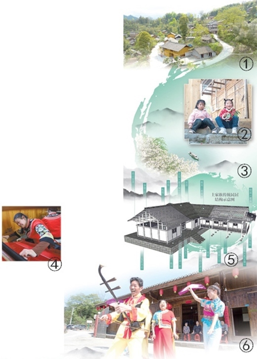 圖①:俯瞰龍鳳壩鎮(zhèn)大寨村。圖②:孩童們坐在龍鳳壩鎮(zhèn)大寨村的古民居前。圖③:大溪鄉(xiāng)前進(jìn)村的臨水風(fēng)光。圖④:在龍鳳壩鎮(zhèn)大寨村,村民正制作土家織錦。圖⑤:土家族傳統(tǒng)民居結(jié)構(gòu)示意圖。張丹峰繪 圖⑥:在溪口鎮(zhèn)黃楊扁擔(dān)村,村民們演唱秀山民歌《黃楊扁擔(dān)》。圖①②③④⑥均為沈靖然、胡程攝影報道