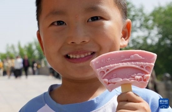 一名小朋友展示父母給買(mǎi)的趙州橋文創(chuàng)雪糕(4月25日攝)。新華社記者 王毓國(guó) 攝