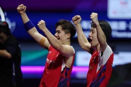5月5日,中國(guó)隊(duì)組合梁偉鏗(左)/王昶在男子雙打比賽后慶祝勝利。新華社記者 陳斌 攝