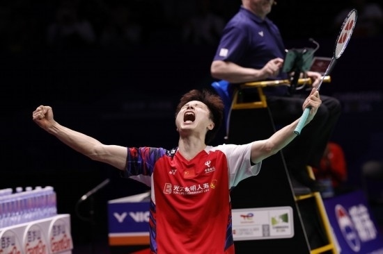5月5日,中國(guó)隊(duì)選手石宇奇在男子單打比賽后慶祝獲勝。新華社記者 沈伯韓 攝