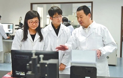彭壽(右一)在指導(dǎo)實(shí)驗(yàn)。中建材玻璃新材料研究總院供圖