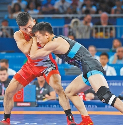 當(dāng)?shù)貢r間8月6日,中國隊選手曹利國(右)在巴黎奧運(yùn)會男子古典式摔跤60公斤級決賽中。環(huán)球時報記者 李 昊攝