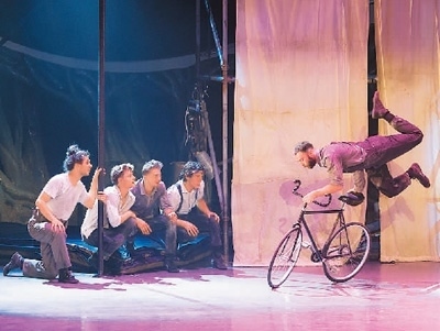 開幕式上,加拿大雜技表演藝術(shù)家?guī)砹藙∧俊恶R戲機(jī)器》,劇中6位角色各有所長(zhǎng),他們憑借精湛的技藝,巧妙駕馭蹺蹺板、雜耍棍、架子鼓乃至浴巾等各式道具,表演既洋溢著詩意,又不失詼諧幽默與風(fēng)趣。