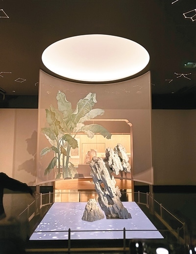 步入上海博物館東館最新開(kāi)放的“中國(guó)歷代書(shū)法”展廳,觀眾會(huì)立刻沉浸于一種雅致、古典的氛圍。序廳正中立著一尊太湖石雕塑,上方的燈光宛如一輪圓月,石后的幕布上繪著一樹(shù)芭蕉,石下的LED屏幕顯出一汪碧色湖水,伴著間或響起的水滴聲,蕩起漣漪。