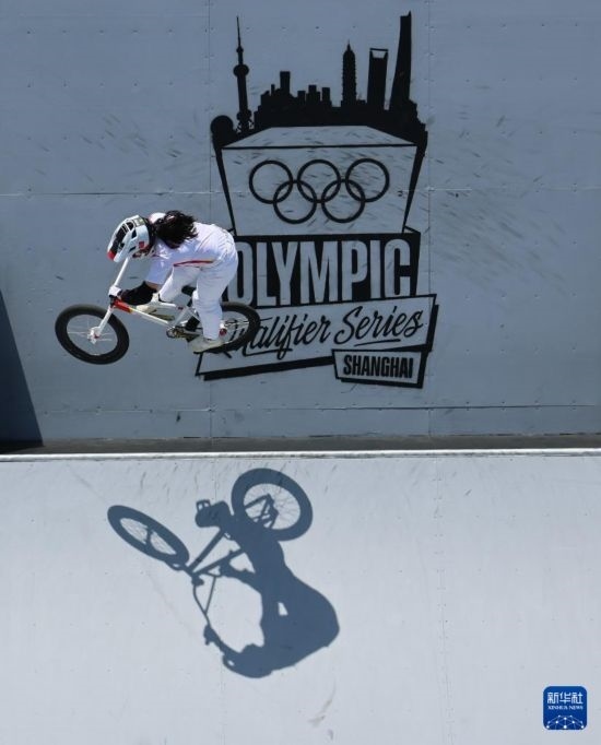 這是2024年5月18日,中國選手鄧雅文在巴黎奧運(yùn)會(huì)資格系列賽上海站小輪車自由式女子公園賽決賽中。新華社記者 王楷焱 攝