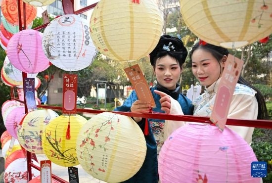 1月19日,身著漢服的居民在社區(qū)廟會(huì)上猜燈謎。