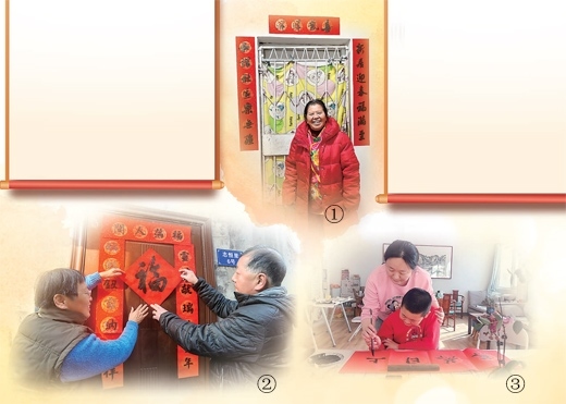 圖①:貼好春聯(lián),彭其碧笑意盈盈。