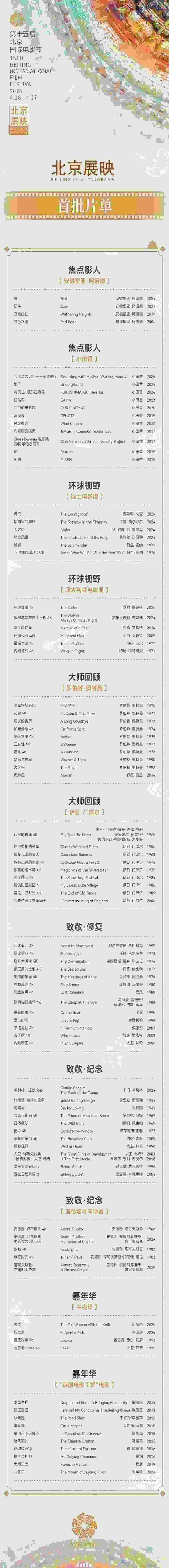 據介紹,本屆“北京展映”共策劃18個展映單元,遴選近300部來自世界各地的優(yōu)秀影片,將于4月18日至27日,在京津冀地區(qū)的33家核心商業(yè)影院、藝術影院及劇院放映約900場次。