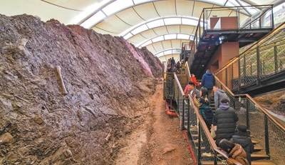 游客在重慶云陽世界地質(zhì)公園參觀恐龍化石墻。