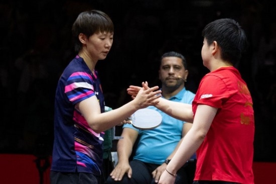 5月25日,王曼昱(左)與孫穎莎(右)賽后互相致意。新華社記者 肖藝九 攝