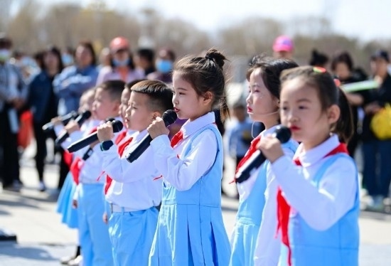 4月1日,小朋友在康巴什區(qū)亞洲雕塑藝術(shù)主題公園朗誦詩(shī)歌。