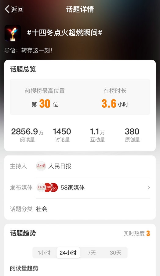國(guó)內(nèi)多家主流媒體對(duì)開(kāi)幕式進(jìn)行報(bào)道,話(huà)題#十四冬開(kāi)幕式# #十四冬點(diǎn)火超燃瞬間#等話(huà)題登上微博熱搜榜,閱讀量近8000萬(wàn)。