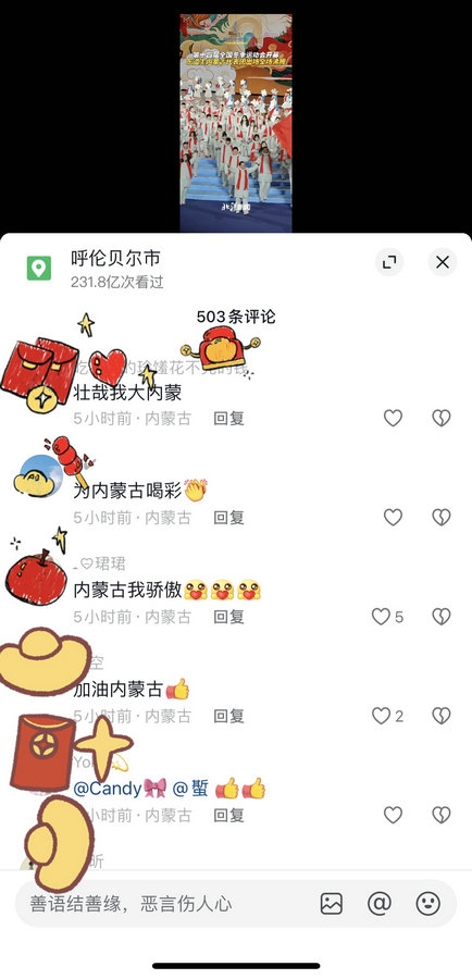 網(wǎng)友紛紛表示:“為內(nèi)蒙古喝彩”“內(nèi)蒙古我驕傲”“這個(gè)地方挺漂亮,祝運(yùn)動(dòng)會(huì)圓滿(mǎn)成功”等。