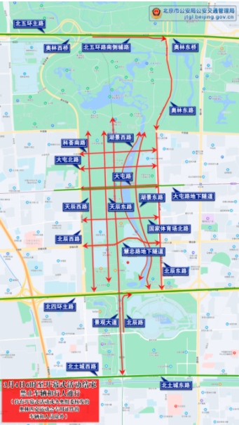 五、19時(shí)至開幕式結(jié)束,北四環(huán)路北側(cè)輔路(安慧橋至北辰西橋),除持有開幕式P5停車場(chǎng)專用證件的車輛和相關(guān)證件的人員外,禁止其他車輛和行人通行。