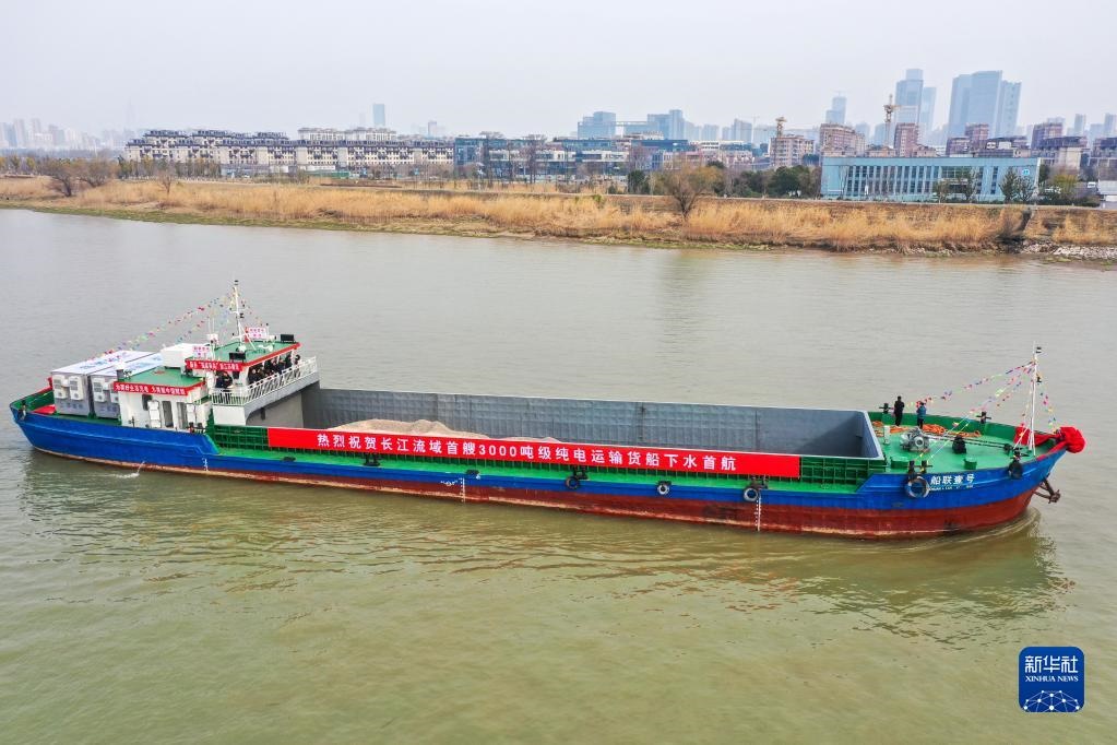 “船聯(lián)1號(hào)”電動(dòng)貨船在長(zhǎng)江南京段航行(2月22日攝,無人機(jī)照片)。