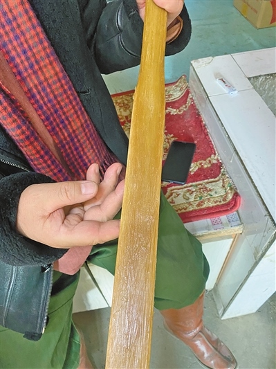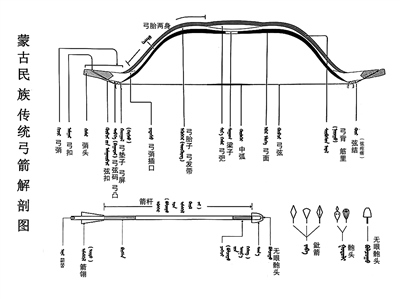 “用彈性很好的竹子或木頭作為弓胎,制作弓里的牛角一般是水牛角,或者巖羊角也可以,貼在弓外的牛筋來(lái)自春天的牛,這時(shí)候牛比較瘦,牛筋油脂少、有彈性。膠則是用魚膘、魚皮、豬皮、馬皮等熬制的膘膠,最外面還要貼一層蛇皮或者樺樹(shù)皮,防止受潮?!敝Z敏朝魯說(shuō)。